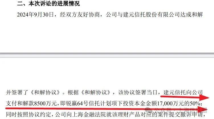 根据《和解协议》,该协议签署当日,建元信托向公司支付和解款8500万元,即锐赢64号信托计划项下投资本金金额17,000万元的50%;