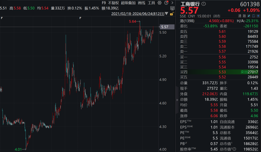 工商银行AH股全天走强,A股涨1.09%,H股涨0.88%,AH股总市值合计达18628亿元。