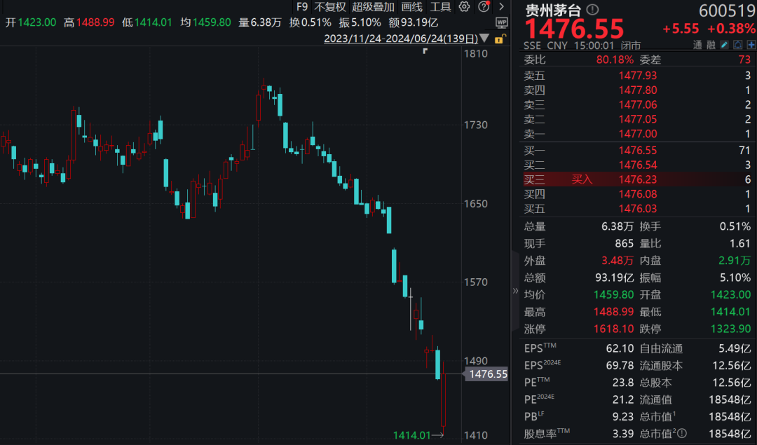 贵州茅台早间大幅低开,股价一度探底1414.01元,跌近4%,总市值一度萎缩至17817亿元,退居A股市值第二大上市公司。盘中,贵州茅台走高,并成功翻红,最高时一度涨逾1%至1488.99元/股,总市值回到18761亿元,再超工商银行。但临近收盘,贵州茅台走弱,以1476.55元收盘,总市值18605亿元,最终失去保持4年之久的A股“股王”宝座。