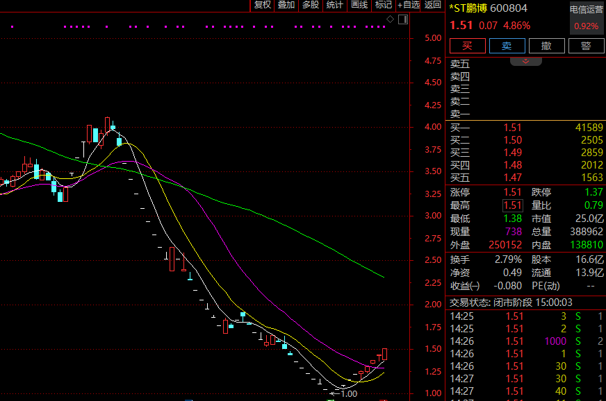 此外,还有不少公司股价触及1元/股后,触底反弹。*ST鹏博年内股价最大下跌近80%,在股价触及1元/股后开启反弹,9个交易日累计上涨51%。