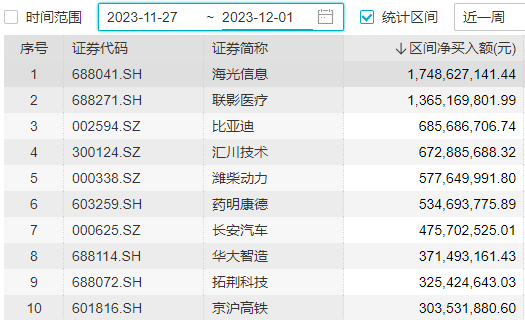 整周来看,海光信息、联影医疗净流入额超过10亿元。