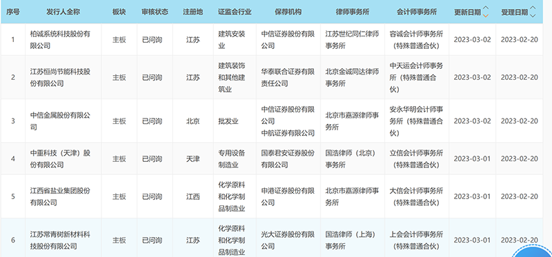 值得注意的是,有6家获上交所受理的主板IPO企业已进入问询环节,并已完成首轮问询与答复。
